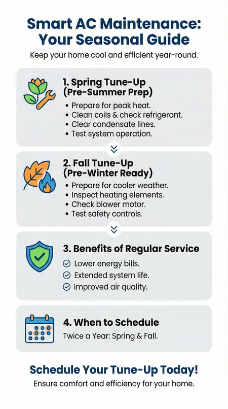 Book your first tune-up in March or early April before summer demand peaks. Schedule the second in October or November when the humidity drops. This timing prepares your system for the intense cooling season and addresses summer wear before problems escalate into emergency calls.